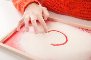As their hand muscles strengthen, children begin mark making. Start with hands-on approaches for a sensory experience by using fingers. Squirt shaving foam, poster paint or sand onto a plate for children to make patterns in – seeing how their finger actively draws lines and makes the foam, paint or sand move can help your child to establish an understanding of cause and effect through mark making. Not only this, but the freedom of using their hands in sensory play can stimulate your child’s imagination and creativity. If messy play is not an option, another activity idea is to roll out a large sheet of paper for children to draw or scribble on. You can encourage the use of tools such as oversized crayons so that children can work on their grip whilst mark making. Displaying any artwork children make in classrooms or around the house can improve confidence in their skills and boost interest in learning to write.