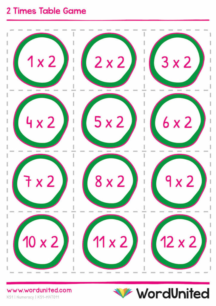 Learn the 2 Times Table with this handy matching activity! Children can improve motor skills as they carefully cut out the cards. Designed with bright, engaging colours to make learning times tables fun, this matching game can be played individually or in groups, making it a wonderful classroom resource. Supports the following area of learning within Key Stage 1 and 2: Maths.