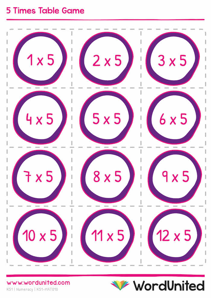 Learn the 5 Times Table with this handy matching activity! Children can improve motor skills as they carefully cut out the cards. Designed with bright, engaging colours to make learning times tables fun, this matching game can be played individually or in groups, making it a wonderful classroom resource. Supports the following area of learning within Key Stage 1 and 2: Maths.