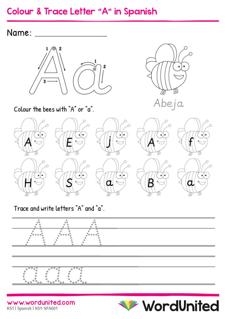 Combine learning Spanish with handwriting and letter formation with this Colour & Trace worksheet. For letter ‘A’, children can learn how to say ‘bee’ in Spanish.
