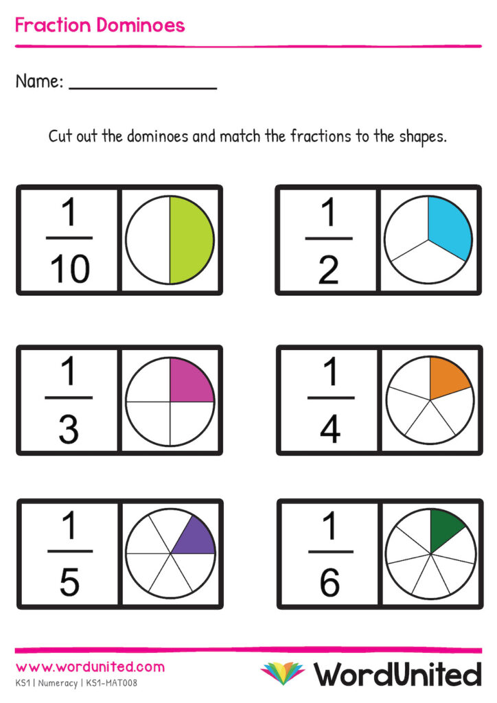 Learning fractions for kids is fun and easy when you use a multi-sensory approach. Use math worksheets including fractions worksheets to help children practice fractions. Combine this with the free fraction wall and fraction games KS2 and activities, which engage children and support the National Curriculum. All these resources are free to download, print, use and share. For hands-on resources, explore magnetic fractions, fraction tiles and more. If you like this dominoes game, you will enjoy this fraction dominoes too. Watch a video on learning fractions for kids and read tips to help children learn fractions on this blog.