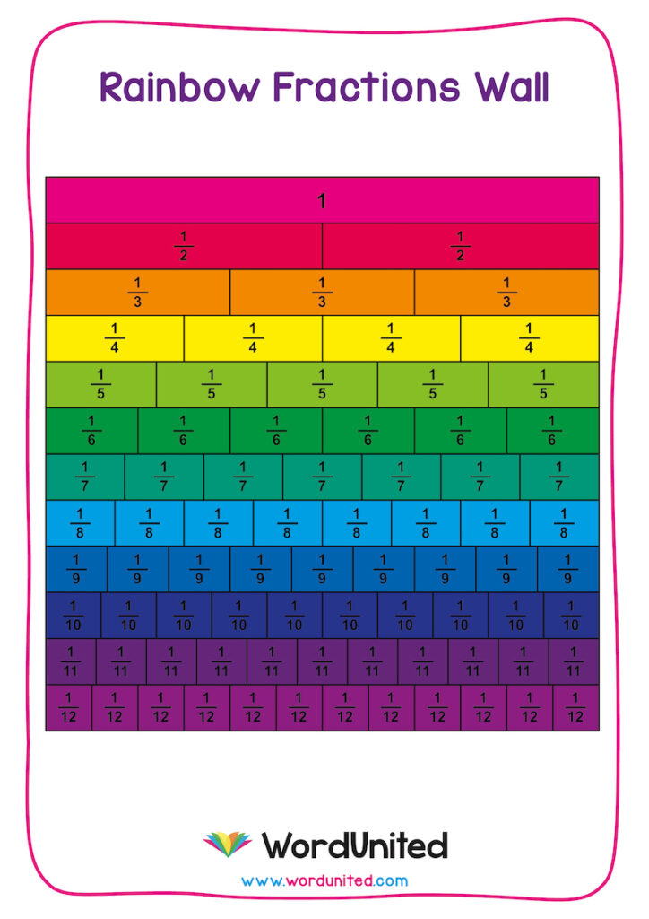 Welcome to this colourful fraction wall for making learning fractions for kids fun! This free printable rainbow fractions wall helps children learn fractions with ease plus it will look great on any classroom, or home, wall. The fraction wall has each fraction colour-coded in bright rainbow colours.
