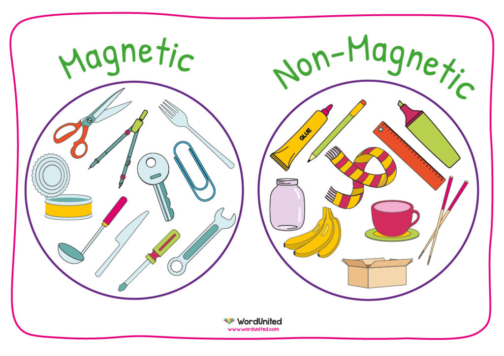 Let’s learn about magnets! Cut and stick the objects in the correct circle. This free sorting activity helps children learn about magnetic and non-magnetic objects.