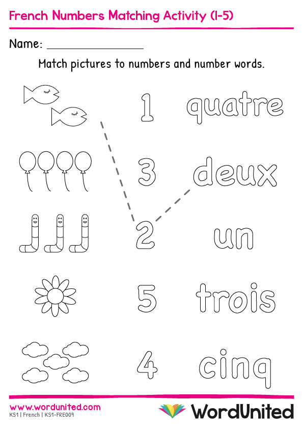 Reinforce learning numbers 1-5 in French with this brilliant worksheet! Children can match the pictures, numbers and words to help consolidate their French vocabularly. Supports the following areas of learning within Key Stage 1: Languages.