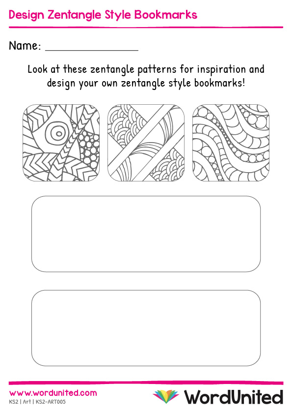 Drawing on the zentangle examples, children can design their own bookmarks in this worksheet, encouraing creativity and imaginative thinking. Can be cut out to make individual bookmarks for children to use in their reading books. Supports the following area of learning within Key Stage 2: Expressive Arts & Design.