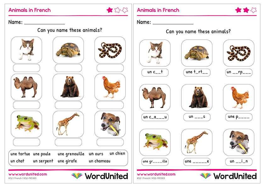 Differentiated for all abilities, this worksheet is a great resource for children learning the names of animals in French. Includes answer sheet.