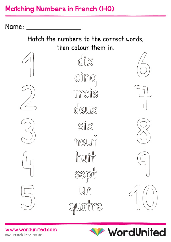 Using this matching activity worksheet, children can build their knowledge of numbers 1-10 in French. Includes answer sheet.