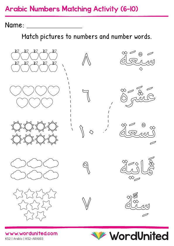 Reinforce learning numbers 6-10 in Arabic with this brilliant worksheet! Children can match the pictures, numbers and words to help consolidate their Arabic vocabulary.