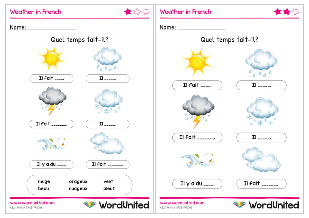 Differntiated for all abilities, this brilliant resource is a wonderful way to reinforce French weather vocabularly. Children will find the bright and colourful illustrations engaging. Includes answer sheet.