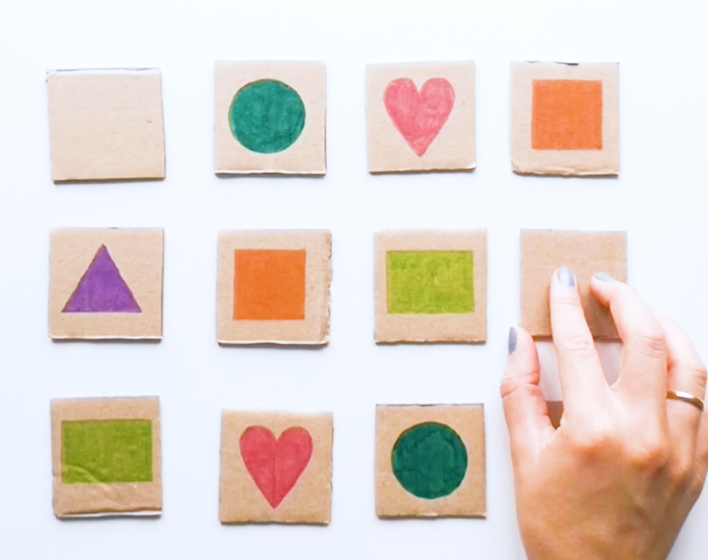 Let’s begin with a crafty option that you (or your child) can make by upcycling an old cardboard box. If, like many, you are ordering more online due to COVID-19 – chances are, you will have some empty boxes scattered around the house! The good news is that these can be repurposed into a fun memory game for kids. Carefully, cut out squares of cardboard using child-safety scissors. Next, draw and colour pairs of items on the squares. This is a brilliant opportunity for children learning shapes to practice their 2D shapes and colour recognition.
